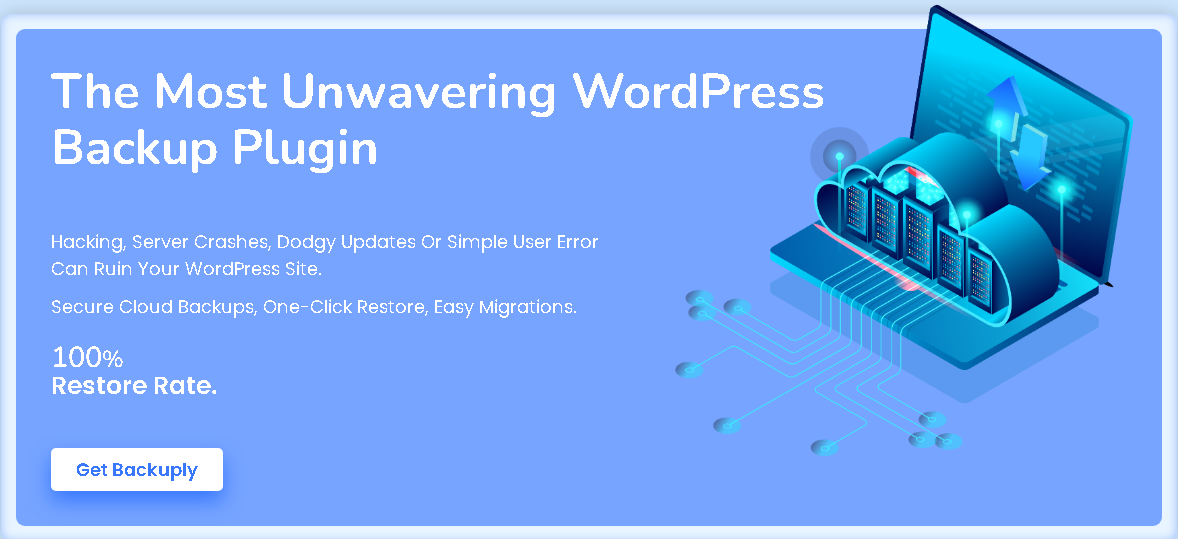 Backuply Pro es el plugin de copias de seguridad para WordPress más confiable, diseñado para proteger tu sitio web contra cualquier eventualidad, desde ataques de hacking y fallos del servidor hasta actualizaciones problemáticas o errores humanos. Con Backuply Pro, puedes asegurar tus datos en la nube, restaurar tu sitio con un solo clic y migrar tu WordPress fácilmente, garantizando una tasa de restauración del 100% y la tranquilidad que tu negocio digital necesita.