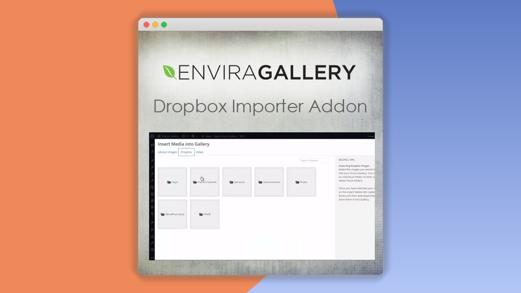 Envira Gallery – Dropbox Importer Addon te permite importar fácilmente tus imágenes y videos directamente desde tu cuenta de Dropbox a tus galerías de Envira Gallery en WordPress. Simplifica tu flujo de trabajo organizando y mostrando tus contenidos multimedia de la nube sin necesidad de descargas intermedias, ahorrando tiempo y esfuerzo.