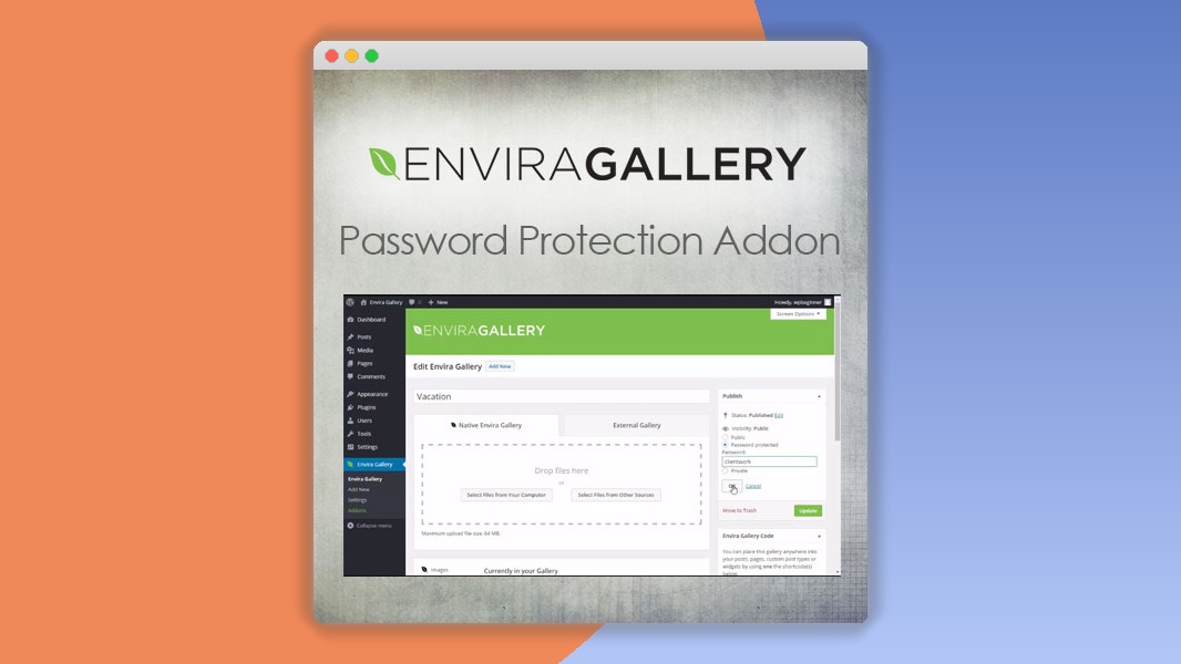 Envira Gallery – Password Protection Addon protege tus galerías de WordPress contra accesos no autorizados mediante la implementación de contraseñas. Este potente complemento para Envira Gallery te permite restringir el acceso a colecciones de imágenes específicas, asegurando que solo los usuarios autorizados puedan visualizarlas, lo cual es ideal para contenido sensible o exclusivo.