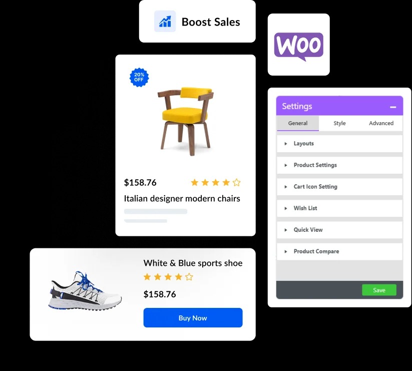- El plugin ofrece diversas opciones para ajustar el estilo, color, bordes, y la presentación de elementos como imágenes, títulos y precios, permitiéndote adaptar la estética de cada producto para que coincida con tu marca.